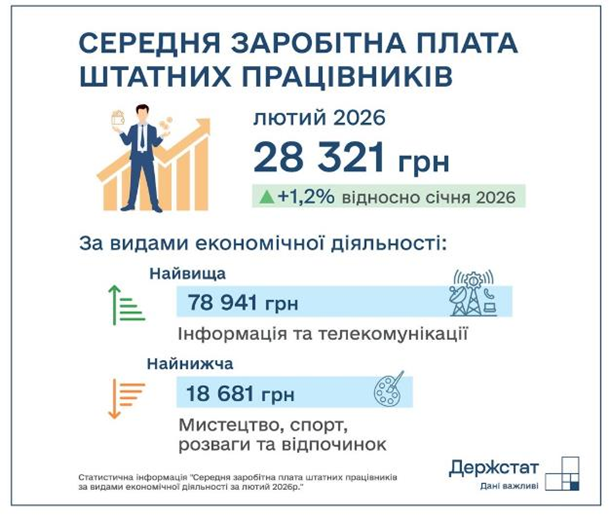 В Украине в феврале 2026 года средняя заработная плата штатных работников составила 28 321 гривен, что на 1,2% больше, чем в январе (27 975 грн, +1,2%). Об этом сообщила Государственная служба статистики. Самый высокий уровень зарплат зафиксирован в Киеве (45 651 грн) и Киевской области (29 077 грн). Самый низкий уровень оплаты труда - у работников Кировоградщины (20 083 грн) и Черновицкой области (20 460 грн). Лидером по уровню заработных плат остается сектор информации и телекоммуникаций - 78 941 грн (в январе - 76 905 грн). Самая низкая заработная плата у работников сферы искусства, спорта, развлечений и отдыха - 18 681 грн (в январе - 13 822 грн). Задолженность по выплате заработной платы на 1 марта 2026 г. составляет 3,5 млн грн.