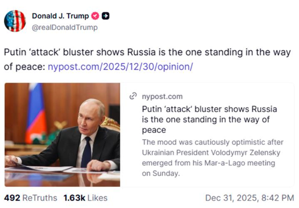 Президент США Дональд Трамп сделал репост на своей странице в социальной сети Truth Social, поделившись публикацией New York Post с заголовком: Заявление об "атаке" на Путина показывает, что именно РФ стоит на пути мира. В статье издания подчеркивается, что заявления Кремля о якобы украинском ударе по резиденции Путина являются ложью. При этом указывается, что любые атаки на российского диктатора были бы оправданы: